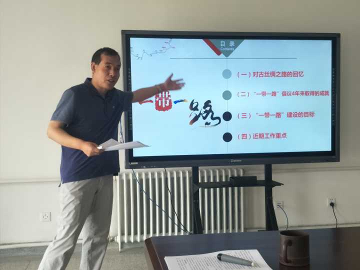 贾书记重点从以下四个方面解读了习近平总书记在“一带一路”国际合作高峰论坛开幕式演讲的主要内容,一是对古代丝绸之路的回忆,从和平合作、开放包容、互学互鉴、互利共赢四个方面回顾了古丝绸之路见证了陆上“使者相望于道,商旅不绝于途”的盛况,也见证了海上“舶交海中,不知其数”的繁华;二是对“一带一路”倡议4年来取得的成就,从政策沟通、设施联通、贸易畅通、资金融通、民心相通五个方面进行了总结,实践证明,“一带一路”倡议顺应时代潮流,适应发展规律,符合各国人民利益,具有广阔前景;三是规划了“一带一路”建设的目标和愿景,即要将“一带一路”建成和平之路、 建成繁荣之路、建成开放之路、建成创新之路、建成文明之路;四是“一带一路”建设近期的7项重点工作,即中国愿在和平共处五项原则基础上,发展同所有“一带一路”建设参与国的友好合作,中国愿同很多国家达成了“一带一路”务实合作协议,我国愿同各国加强创新合作,启动“一带一路”科技创新行动计划,开展科技人文交流、共建联合实验室、科技园区合作、技术转移4项行动,我国将在未来3年向参与“一带一路”建设的发展中国家和国际组织提供600亿元人民币援助,建设更多民生项目,向“一带一路”沿线发展中国家提供20亿元人民币紧急粮食援助,向南南合作援助基金增资10亿美元,在沿线国家实施100个“幸福家园”、100个“爱心助困”、100个“康复助医”等项目,将向有关国际组织提供10亿美元落实一批惠及沿线国家的合作项目,我国将设立“一带一路”国际合作高峰论坛后续联络机制,成立“一带一路”财经发展研究中心、“一带一路”建设促进中心,同多边开发银行共同设立多边开发融资合作中心,同国际货币基金组织合作建立能力建设中心,我国将建设丝绸之路沿线民间组织合作网络,打造新闻合作联盟、音乐教育联盟以及其他人文合作新平台。