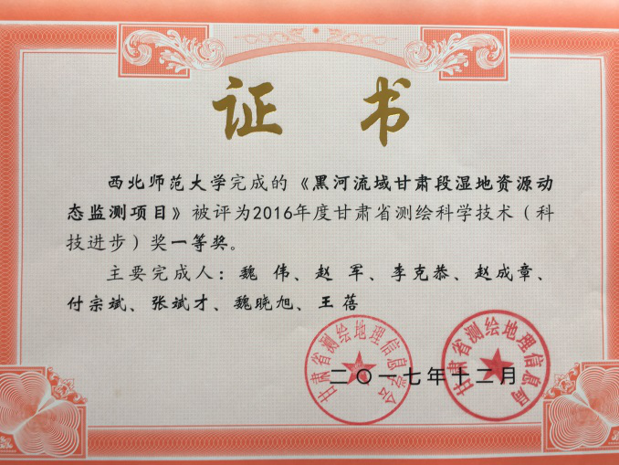 在12月26日召开的2017年甘肃测绘地理信息学会学术年会上,我院魏伟副教授作为项目负责人,赵军、赵成章等作为主要成员参与的“黑河流域甘肃段湿地资源动态监测”项目荣获2016年度测绘科技进步一等奖。“黑河流域甘肃段湿地资源动态监测”项目由我院牵头,并与甘肃省基础地理信息中心共同合作完成,其成果为我省湿地资源普查等应用提供了重要的基础支撑。