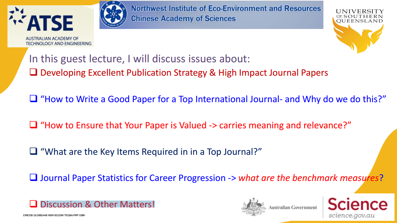 Ravinesh C Deo副教授分别从“Developing Excellent Publication Strategy & High Impact Journal Papers”、“How to Write a Good Paper for a Top International Journal- and Why do we do this?”、“How to Ensure that Your Paper is Valued -> carries meaning and relevance?”、“What are the Key Items Required in in a Top Journal?”、“Journal Paper Statistics for Career Progression -> what are the benchmark measures?”、“Discussion & Other Matters” 六个方面,详尽介绍了高质量期刊论文写作和投稿中的注意事项。最后,Ravinesh C Deo副教授为我院师生解疑释惑,不仅回答了师生提问,而且提出可行的建议。