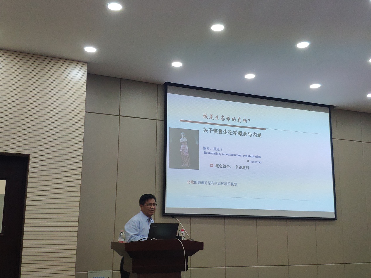李新荣研究员从主要理论与假说、主要的措施与生态工程建设、荒漠生态系统恢复过程的植被-土壤系统基、本特征和水环境的演变规律、荒漠生态系统恢复的一个理论假说、生态工程建设的环境效应的评价、生态恢复速率模拟预测、荒漠区木本植物多样性及维持机理七个方面,详尽介绍了荒漠生态系统恢复理论与理论假设,并系统总结了立论于理论假设的研究结果。最后,李新荣研究员热情地回答了师生提问。