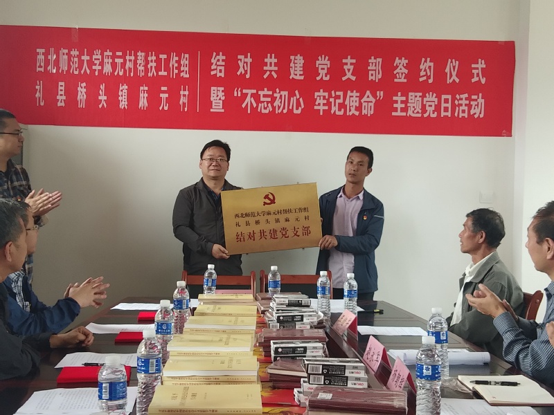 6月29日,在党的98岁生日到来之际,西北师范大学yL23411永利官网登录院办教工党支部与礼县桥头镇麻元村党支部在麻元村党员活动室举行了结对共建党支部签约仪式暨“不忘初心,牢记使命”主题党日活动。西北师范大学礼县桥头镇麻元村帮扶工作组部分责任单位负责人、院办教工党支部党员代表、桥头镇相关负责人、麻元村党支部成员、西北师范大学麻元村帮扶工作队成员参加了活动。