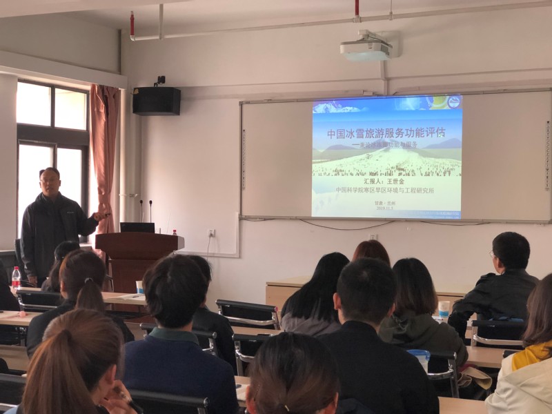 报告会上,王世金副研究员以冰冻圈功能与服务为切入点,详细介绍了我国冰雪旅游的服务机遇、空间格局以及冰雪旅游服务潜力评估方法,并就“冰川景观物质亏损评估”“造雪、雪道物质亏损演变”两个科学问题与我院师生进行了深入探讨与交流。