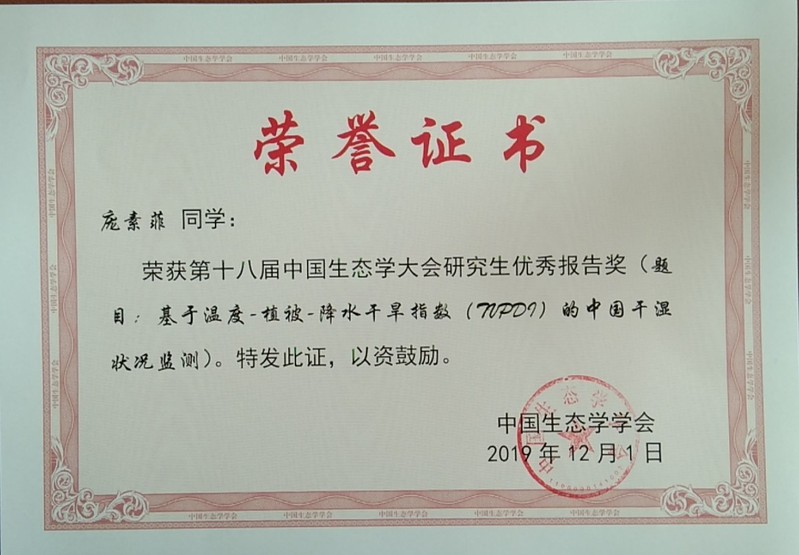 同时,我院研究生庞素菲荣获第十八届中国生态学大会研究生优秀报告奖。