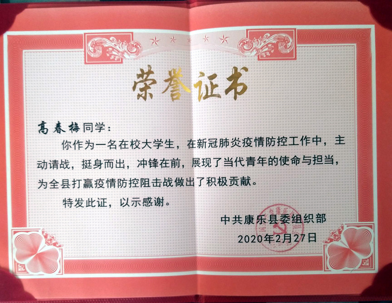 同班高春梅同学在康乐县附城镇高丰村村口门岗检查点值守,排查来往车辆和人员,为村民做防疫宣传、发放口罩、喷洒和发放消毒剂等。由于表现突出,高春梅同学得到了康乐县委组织部的表扬。