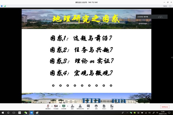 报告会上,程叶青教授从“选题与前沿、任务与兴趣、理论or实证、宏观与微观”等四个地理研究的困惑出发,提出“注重学科交叉、突出区域特色”的研究思路,并就人文地理学的学科特性、理论、内容及方法等进行了深入讲解。在此基础上,程教授也向同学们分享了自己在求学工作、研究方向、实践案例等方面的一些积累、做法和效果,充分显示了学者求真务实的风范,在线的老师和同学受益匪浅。