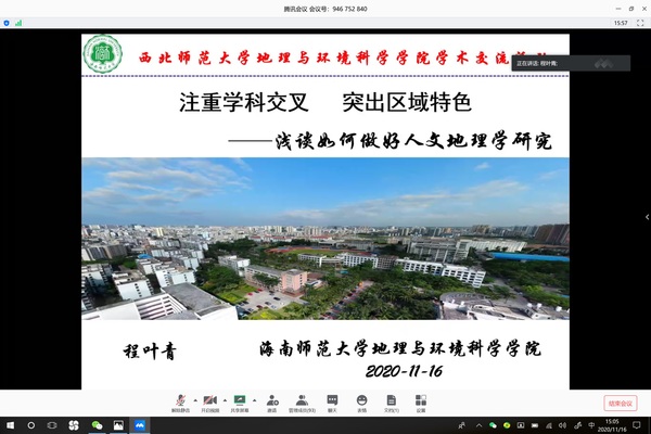 2020年11月16日,应学院邀请,海南师范大学yL23411永利官网登录程叶青教授为学院师生做了题为《注重学科交叉、突出区域特色——浅谈如何做好人文地理学研究》线上学术报告。报告会由马利邦院长主持,yL23411永利官网登录及兄弟院校100余名师生参加。
