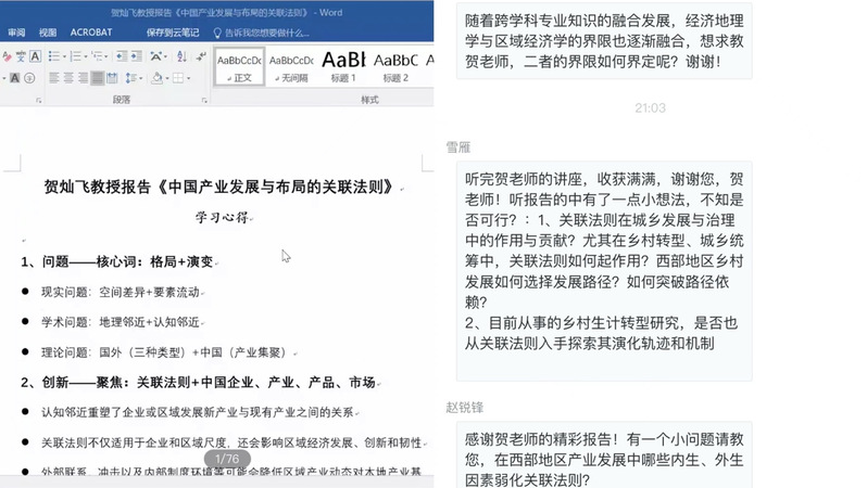 叶超教授代表西北城乡发展与协同治理研究院作总结发言,他首先感谢贺灿飞教授对西部地区院校的大力支持,认为此次报告集中体现了贺灿飞教授团队近年来学术研究的体系化,即以问题为导向,以现实问题为着眼点开展实证研究,实现了理论研究与问题解决的有机结合。同时,他呼吁大家应当聚焦深耕某一领域进行理论创新,积极开展学科交叉研究,及时捕捉国际学术前沿,加快与本土化实践的紧密结合。会后,贺灿飞教授与参会师生进行了深入广泛的线上交流。