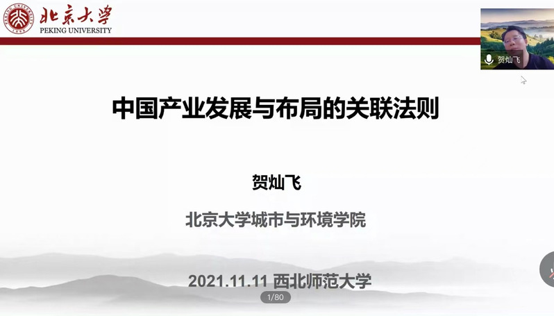 2021年11月11日,由西北师范大学西北城乡发展与协同治理研究院、yL23411永利官网登录联合举办的“第二届西北城乡发展与协同治理研究院2021年前沿论坛”在线举行。北京大学城市与环境学院院长、我国著名经济地理学者贺灿飞教授应邀做题为《中国产业发展与布局的关联法则》的学术报告。报告由yL23411永利官网登录马利邦院长主持,西北城乡发展与协同治理研究院荣誉院长叶超教授、yL23411永利官网登录于国建书记共同出席,学院以及其他国内高校600余名师生参加。