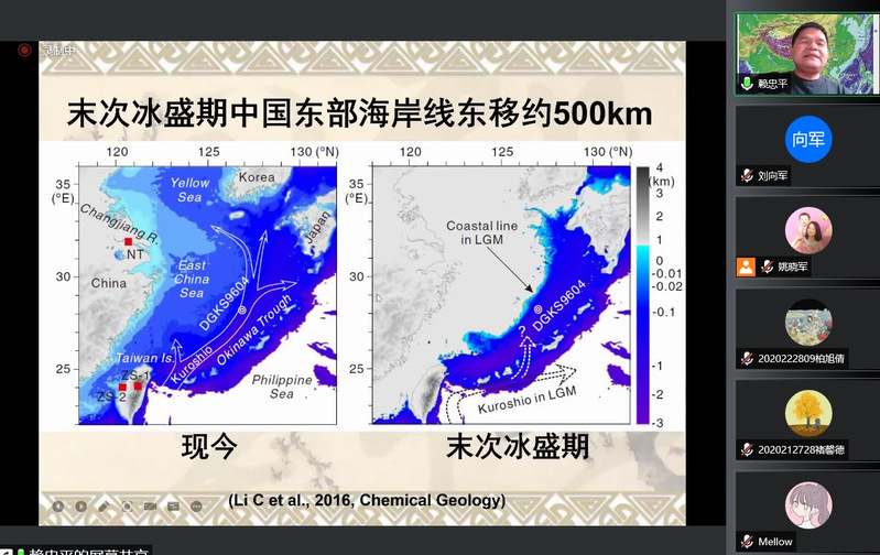 报告伊始,赖忠平教授借用冰期/间冰期旋回来说明轨道尺度上气温的不对称锯齿现象,继而引出高原何时出现古人类活动、下次冰期何时来临、人类何时定居高原及其与全球气候变化的关系等问题,引发了师生共同思考。赖忠平教授首先列举了地球古气候变化的一些重要事件,并讲述了其领导的研究团队在全球古气候研究中取得的最新进展:冰消期时南半球是全球升温的驱动者,冰期大气二氧化碳含量的变化可能跟中低纬地区的过程有关。赖忠平教授进而介绍了其团队研究青藏高原风积物堆积年代和人类从低海拔登上青藏高原并定居生活的过程和历史,介绍了史前人类活动从低海拔向高海拔的青藏高原腹地逐步迁徙的模式。报告结束后,赖忠平教授与参会的师生进行了广泛的线上交流。