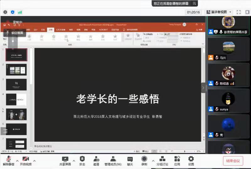 最先为大家进行分享的是彭勇智学长,彭勇智学长以《老学长的一些感悟——工作与学习的问题》为主题,给大家分享了就他在本科阶段所迷茫的主要原因——人文地理与城乡规划二选一的抉择,并就这两个不同的学习主题和就业方面进行了一些对比,然后学长也分享了之前石楠老师给他的建议,希望大家在校期间认真学习,培养团队精神,随时随地的热爱生活,并对人文地理与城乡规划专业本科生在校期间的学习安排做了相关分享。陈绍涵学姐以《市场需求所决定的学习就业方向》为主题,为大家介绍了在校期间相关比赛参赛的情况,并向大家提出城市规划专业就业所必备的四项基础:扎实的技术功底、过硬的心理素质、健康的生活习惯、逐渐严密的逻辑体系。项顺垚学长以《持续学习,不断进步》为主题,为大家分享介绍了求职面试的相关内容,同时鼓励大家在学习过程中坚定信心,提出保持感谢挫折的态度对专业学习的重要作用。在最后的提问交流环节,大家踊跃发言,围绕专业学习的侧重点,相关学习,职业规划等进行了提问,学长学姐就提问积极回答,热情回应,本次线上分享会取得圆满成功!