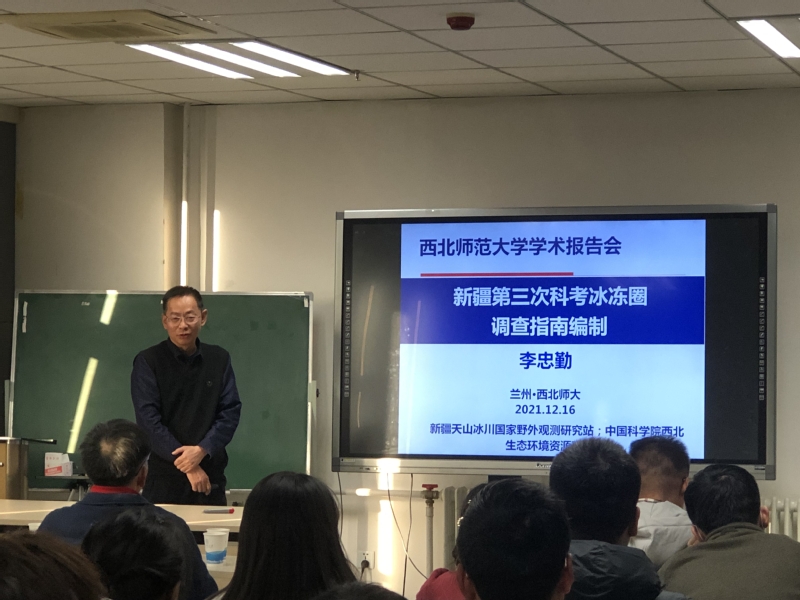 2021年12月16日下午,应yL23411永利官网登录、甘肃省绿洲资源环境与可持续发展重点实验室邀请,中科院西北生态环境资源研究院李忠勤研究员做题为《新疆第三次科学考察冰冻圈调查指南编制》学术报告,报告会由姚晓军副院长主持,学院近百名师生参加。