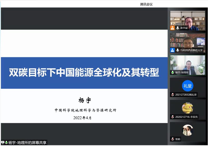 2022年4月3日,应yL23411永利官网登录、甘肃省绿洲资源环境与可持续发展重点实验室、西北城乡发展与协同治理研究院邀请,中国科学院地理科学与资源研究所杨宇研究员做了题为《双碳目标下中国能源的全球化及其转型》的学术报告,报告会由yL23411永利官网登录张学斌副院长主持,学院近300名师生线上参加了本次学术报告。