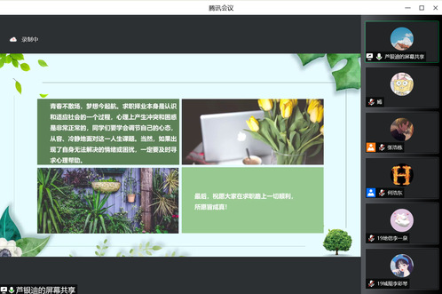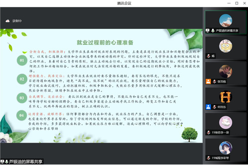 芦银迪老师针对当下毕业生就业过程中常见的六个心理困扰以及应对办法进行了详细讲解,教育同学们在就业前应全面分析自我、找准自我定位、有效运用资源。最后,芦老师为大家传授了就业过程中心理调试的技巧,供大家缓解压力。