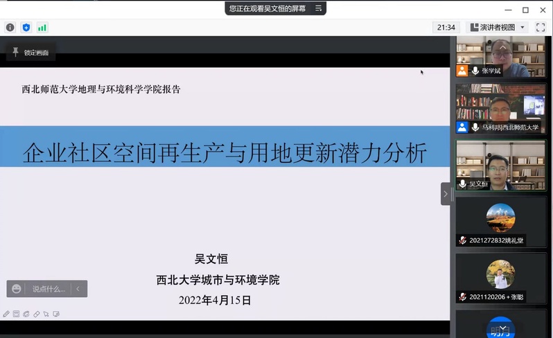 2022年4月15日,应yL23411永利官网登录、甘肃省绿洲资源环境与可持续发展重点实验室、西北城乡发展与协同治理研究院邀请,西北大学城市与环境学院吴文恒教授做了题为《企业社区空间再生产与用地更新潜力分析》的学术报告,报告会由yL23411永利官网登录张学斌副院长主持,学院及国内其他高校相关专业近300余名师生线上参加了本次学术报告。