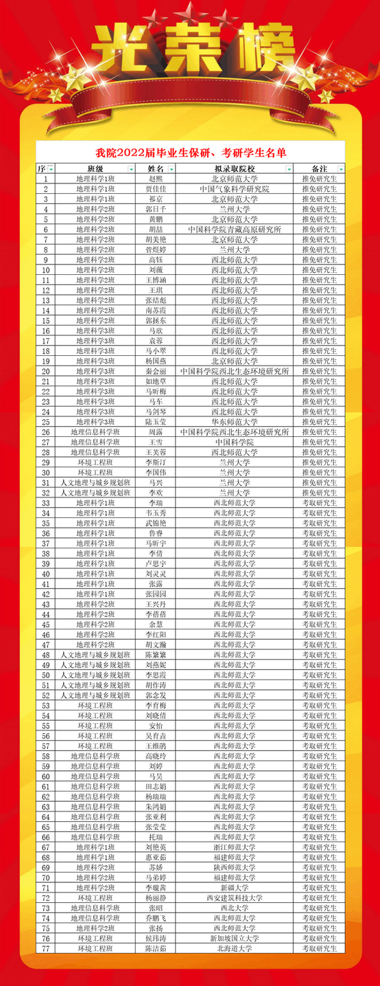 2022年我院本科毕业生升学再创佳绩,升学人数共77人,升学率达到36.16%。升学学生中,推荐免试研究生32人,考取硕士研究生45人,考研率为20.51%。有15人被北京师范大学等“双一流”高校录取,有2人分别被日本北海道大学、新加坡国立大学录取,有39人继续我校攻读硕士研究生。在毕业班级中,地理信息科学班、地理科学1班(云亭班)考研率相对较高,分别达到56.0%、31.6%。