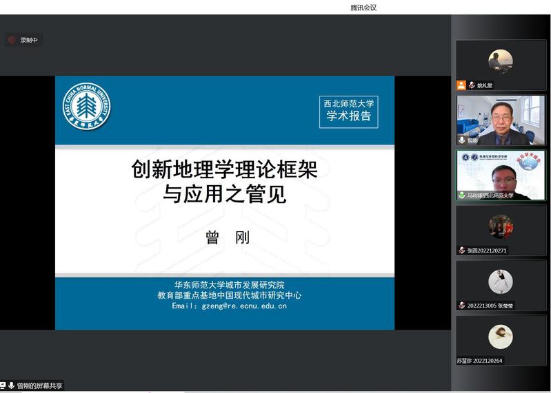 2022年10月30日,应yL23411永利官网登录、甘肃省绿洲资源环境与可持续发展重点实验室、西北城乡发展与协同治理研究院邀请,华东师范大学曾刚教授做了题为《创新地理学理论框架与应用之管见》的学术报告,报告会由yL23411永利官网登录院长马利邦主持,学院教师、研究生,以及国内其他高校相关专业共300余名师生线上参加了本次报告。