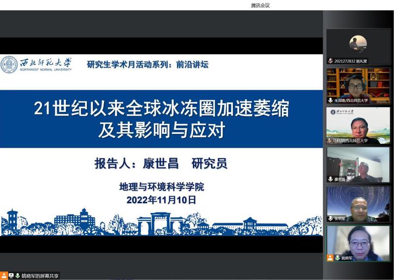 2022年11月10日,应yL23411永利官网登录、甘肃省绿洲资源环境与可持续发展重点实验室、西北城乡发展与协同治理研究院邀请,中国科学院西北生态环境资源研究院康世昌研究员做了题为《21世纪以来全球冰冻圈加速萎缩及其影响与应对》的学术报告,报告会由yL23411永利官网登录副院长姚晓军教授主持,学院教师、研究生,以及国内其他高校相关专业共300余名师生线上参加了本次报告。