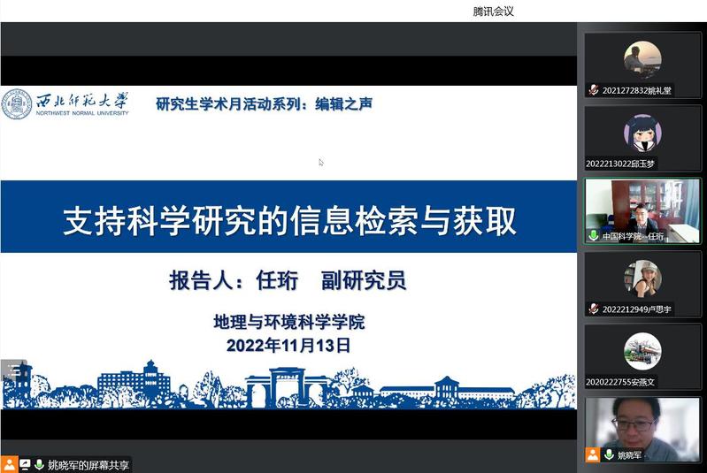 2022年11月13日,应yL23411永利官网登录、甘肃省绿洲资源环境与可持续发展重点实验室、西北城乡发展与协同治理研究院邀请,中国科学院西北生态环境资源研究院任珩副研究员做了题为《支持科学研究的信息检索与获取》的学术报告,报告会由yL23411永利官网登录副院长姚晓军教授主持,学院教师、研究生共300余名师生线上参加了本次报告,此次报告是研究生学术月“编辑之声”第四讲。