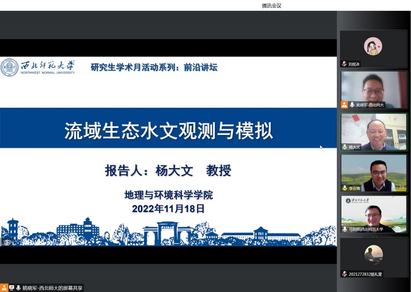 报告会上,杨大文教授围绕研究背景、生态水文过程观测、生态水文耦合机理以及流域生态水文模拟四个方面,详细阐述了生态-水文相互作用、全球能量和水循环实验、生态水文过程机理与规律、流域生态水文模拟模型等内容,指出观测和模拟是流域生态水文研究的主要方法,认识流域生态水文相互作用机理与规律,可为水资源管理和生态文明建设提供科学支撑。杨大文教授报告内容充分详实,线上参会师生积极踊跃,会议取得了良好的效果。