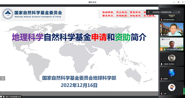 为了做好2023年度国家自然科学基金项目的组织申报工作,切实提升项目申报质量,2022年12月16日,应yL23411永利官网登录邀请,国家自然科学基金委员会熊巨华研究员做了题为《地理科学自然科学基金申请和资助简介》的报告,报告会由yL23411永利官网登录院长马利邦教授主持,学院教师线上参加了本次报告。