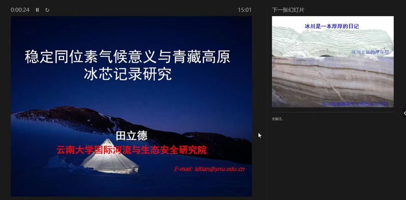 2024年4月11日下午,应yL23411永利官网登录、甘肃省绿洲资源环境与可持续发展重点实验室、西北城乡发展与协同治理研究院邀请,云南大学国际河流与生态安全研究院田立德教授做了题为《稳定同位素气候意义与青藏高原冰芯记录研究》的学术报告,学院部分教师、研究生线上参加了本次报告。