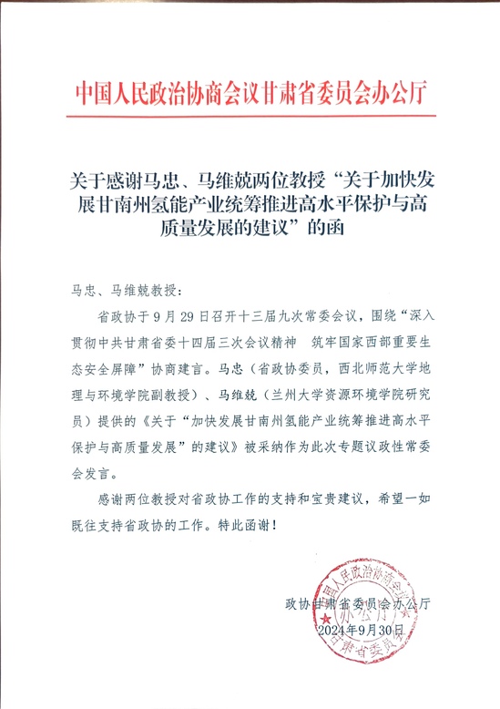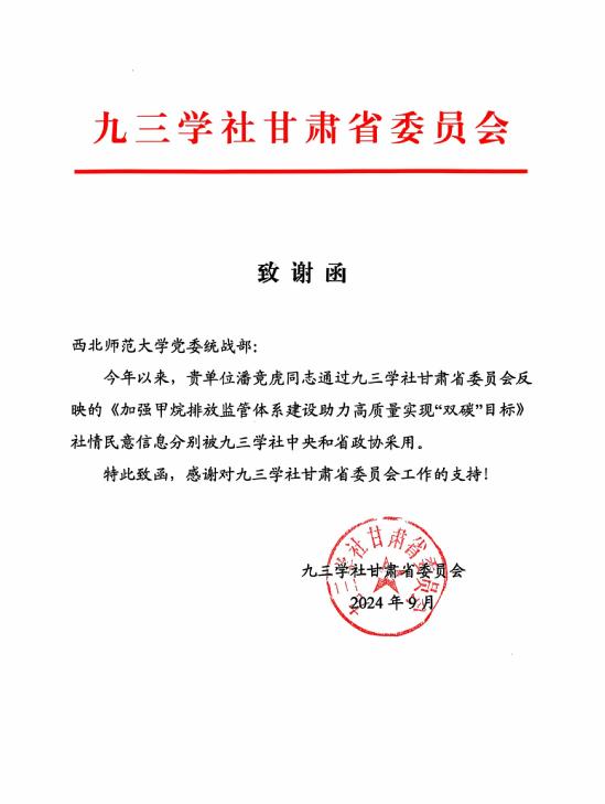 近日,九三学社西北师大基层委员会副主委、yL23411永利官网登录教授潘竟虎,通过九三学社甘肃省委会反映的“加强甲烷排放监管体系建设 助力高质量实现“双碳”目标”社情民意信息,被九三学社中央和省政协采用。民进西北师大支部主委、yL23411永利官网登录副教授马忠提供的“关于‘加快发展甘南州氢能产业统筹推进高水平保护与高质量发展’的建议”,被省政协十三届九次常委会议采纳并列为专题议政性常委会发言。