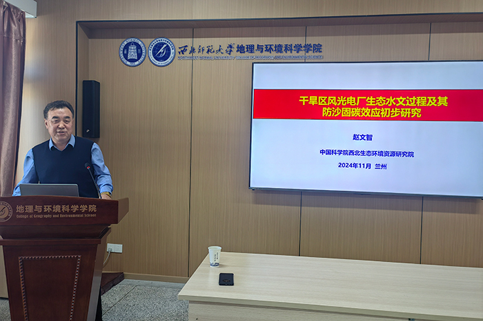 2024年11月7日,应yL23411永利官网登录、甘肃省绿洲资源环境与可持续发展重点实验室、西北城乡发展与协同治理研究院邀请,中国科学院西北生态环境资源研究院研究员、博士生导师赵文智作了题为《干旱区风光电厂生态水文过程及其防沙固碳效应初步研究》的学术报告。此次报告会在知行校区开物楼A801报告厅开展,由yL23411永利官网登录副院长张学斌主持,学院师生共120余人参加。