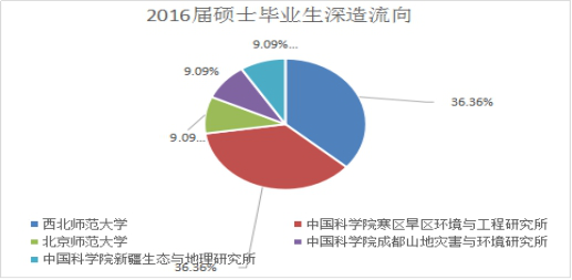 从2016届硕士毕业生升学的高校分布来看,36.36%的学生考博院校为本校,36.36%的学生考博院校为中国科学院寒区旱区环境与工程研究所,其次为北京师范大学、中国科学院成都山地灾害与环境研究所、中国科学院新疆生态与地理研究所;72.73%的升学去向在甘肃省内;从升学院校来看,除本校外其他院校大部分为科研院所,深造前景较好(详见图1-7)。