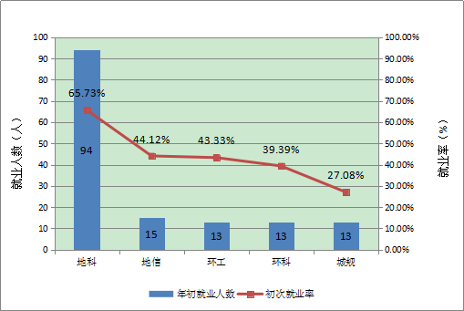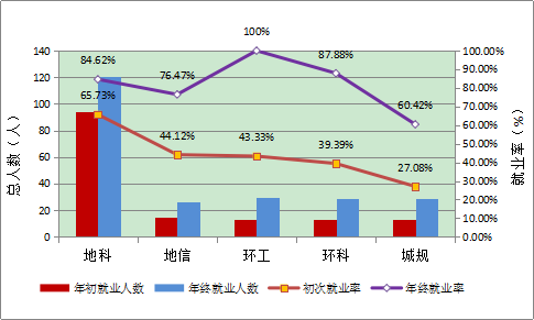 如图1-10所示,从各专业初次就业率和年终就业率来看,环境工程专业毕业生在毕业半年内就业人数较多,就业率上升最为明显;地理科学专业毕业生初次和年终就业率都高于本院平均就业率水平,且就业时间多集中于毕业之前;城市规划专业毕业生在两次统计结果中均显示就业率低于我院平均水平。